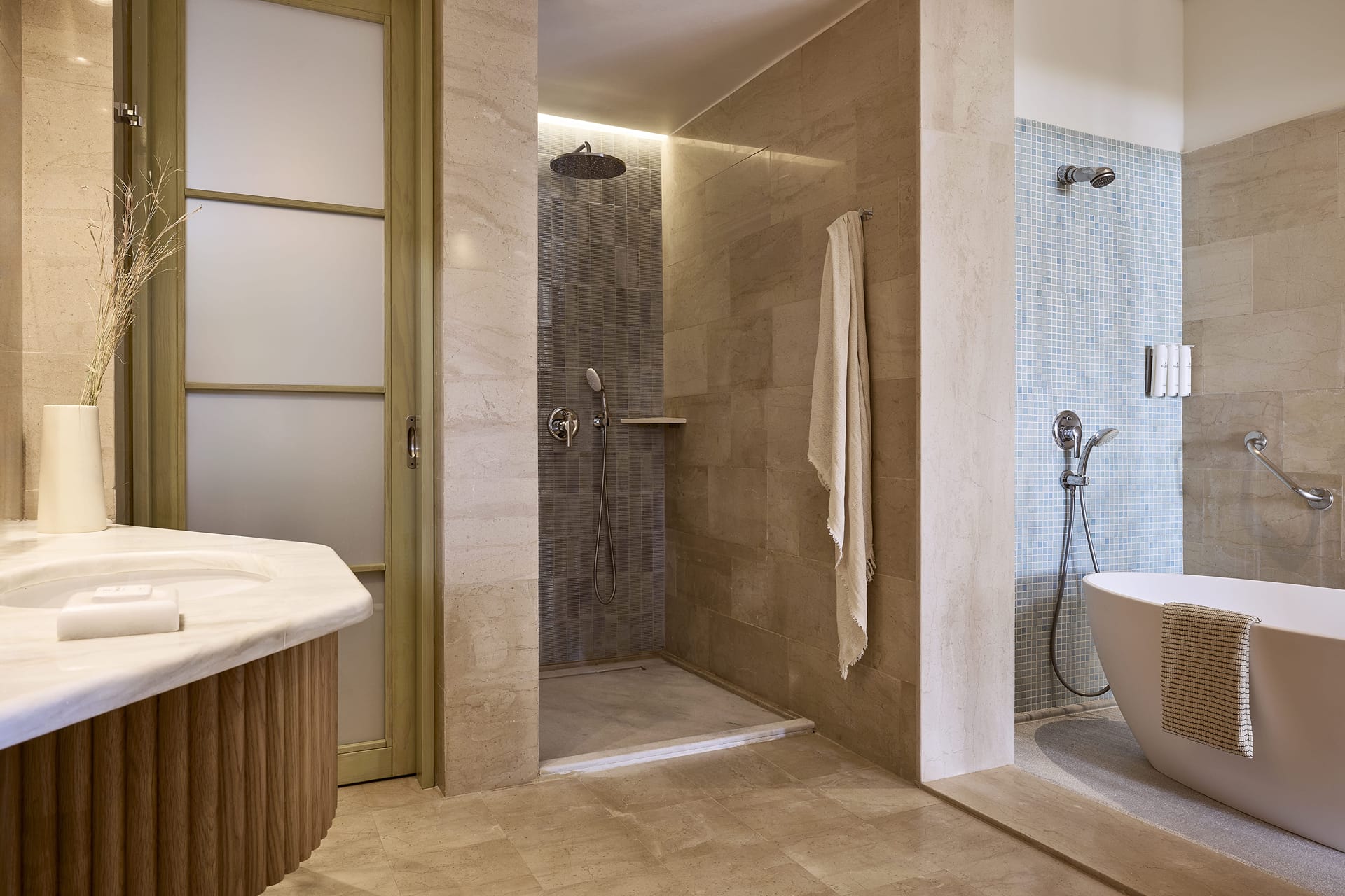 Master Bedroom: En-Suite Marble Lined Bathroom with Hydro massage Bath, Separate WC and walkin shower.